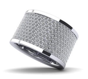This stunning diamond anniversary ring features 9 rows of brilliant cut round diamonds staggered set-in common prong setting. The effect is spectacular. You have the option to customize the ring by selecting the type of metal, diamond quality and ring size.