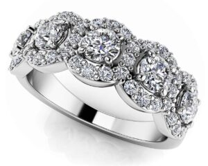 Elegant, feminine and unique, this beautiful anniversary band says so much. A repeating flower shaped design wraps half way around the band to display a sparkling bouquet of icy beauty. Available in your choice of gold or platinum setting, this ring is certain to delight.