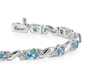 A twist on the classic gemstone bracelet, this design features 13 oval shaped gemstones of your choice, surrounded by round shaped diamonds, and set in your choice of shimmery gold or platinum. Each of the gems is prong-set, allowing the beautiful design of the setting to stand out. A curvy link separates each section of gemstones creating a seamless row of perfection. The bracelet is available in a .26 total diamond carat weight. Design your own version of this bracelet today!