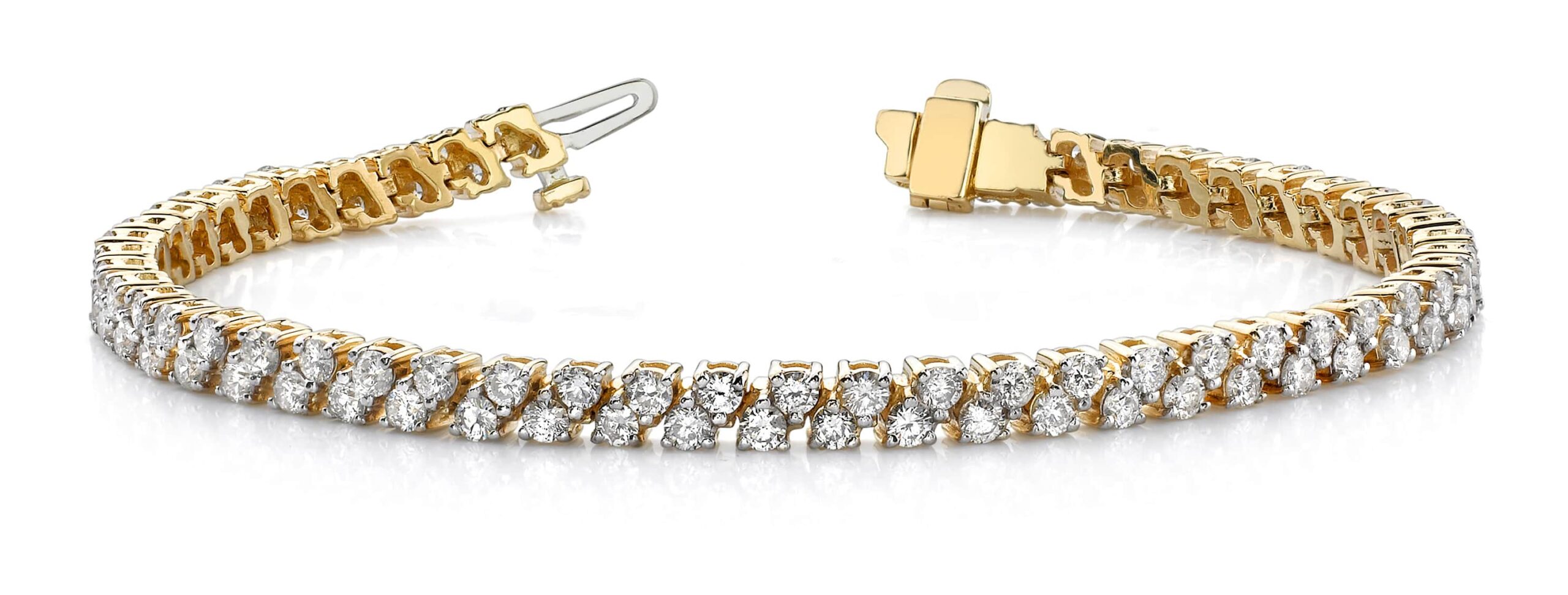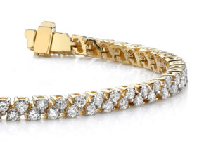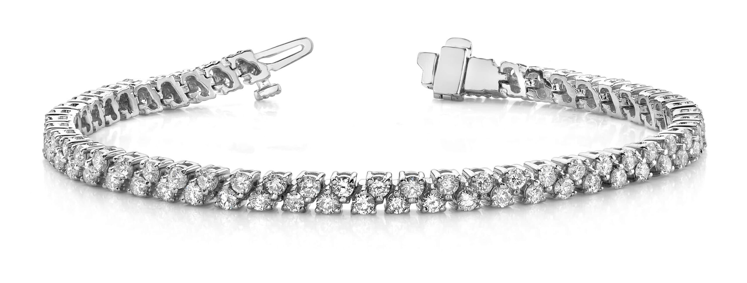 Two incredible rows of diamonds, carefully off-set in a pattern that reminds us of two rows in a checkerboard design. This lovely piece is very versatile, and would look fabulous no matter what mood you’re in, from diva to denim! Available in 3 different sizes, with total diamond weights ranging from 3.3 carats to 6 carats, this one’s sure to please!