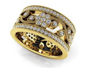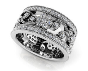 This intricate, feminine design features a delicate flower formed with diamonds and millgrain detailing. This piece is perfect for a special occasion that will make her fall in love all over again. Create the perfect eternity band with your choice of metal type and diamond quality for an unforgettable expression of your love.