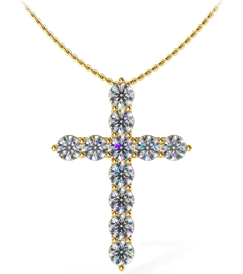 A symbol of faith and timeless beauty, this diamond cross pendant features 11 sparkling diamonds meticulously set in a classic prong setting to maximize light and brilliance. Each diamond is hand-selected for its exceptional clarity and fire, creating a luminous and elegant expression of devotion. Crafted with precision, the clean lines and balanced design of the pendant make it a versatile piece?perfect for both everyday wear and special occasions. Suspended from a matching chain, the pendant rests gracefully against the chest, offering a meaningful and sophisticated statement.