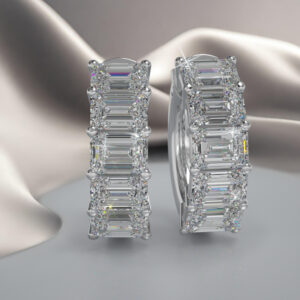 These stunning diamond hoop earrings feature five emerald cut diamonds on each ear. The earrings have a push button locking mechanism for extra security and ease of wear. You may customize these earrings by selecting the type of metal, diamond size, and quality.