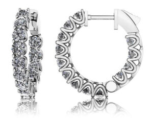 Crafted in your choice of 14k or 18k gold or platinum these diamond inside out huggie earrings are a perfect way to complete a look. Round diamonds are prong set to charm with their endless sparkle. Finished with our easy to use and secure push button closure.