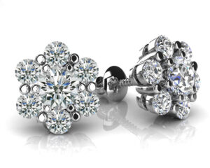 Renew your wardrobe with these sparkly flower shaped earrings. A slightly larger center diamond is surrounded by six smaller round diamonds forming a flower shaped cluster. These versatile studs can be worn day or night. Choose from shimmering gold or pretty platinum and three carat sizes to create the perfect pair of diamond studs!