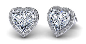 This stunning diamond stud earrings feature heart shape diamonds, surrounded by brilliant cut round diamonds. You may customize these earrings by selecting the type of metal, diamond size and quality.