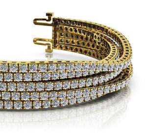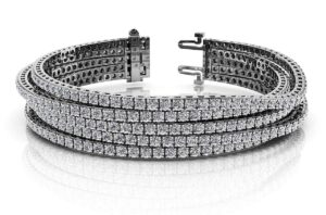 This stunning multi-row diamond bracelet will take your breath away! Five individual strands of brilliant round diamonds are perfectly set to form a show-stopping look of opulence. Flexible and luxurious, the movement and sparkle of this gorgeous piece will light up the room. Available in 3 carat weights in your choice of gold or platinum setting.