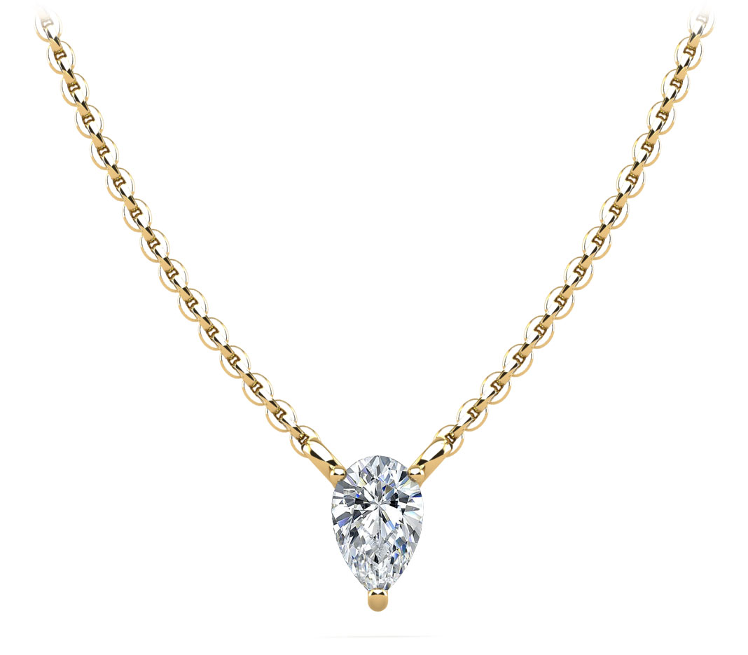 This solitaire pendant features a pear-shape diamond. Wearing this diamond pedant carries elegance everywhere you go. You may customize this pendant by selecting the type of metal, diamond size, and quality.
