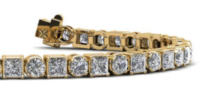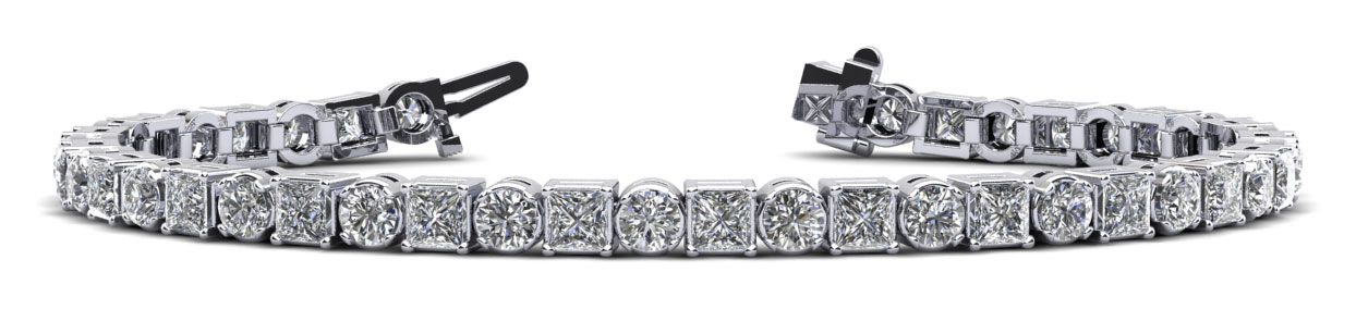 This beautiful tennis bracelet features alternating princess cut and round diamonds for a modern twist on the classic tennis bracelet style. Select yours in your choice of 14k or 18k yellow, rose or white gold or platinum.