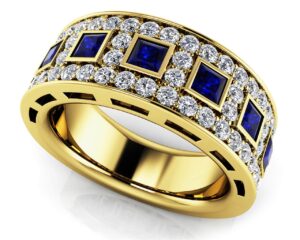 This incredible diamond and gemstone ring combines colorful princess cut gemstones and the sparkling beauty of round diamonds. You’ll love how each of the bezel set princess cut gemstones are accented by smaller round diamonds, prong set in four rows. This stunning anniversary ring design is available in five sizes ranging from .83 to 2.00 total carat weights and your choice of gold or platinum. Because this ring has an eye-catching look with a wider design, you can wear it with an existing engagement ring or by itself!