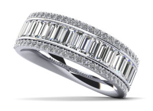 This stunning diamond anniversary ring features 21 perfectly cut baguette diamonds in the center set and 54 brilliant cut round diamonds on the sides. The effect is spectacular. Customize this ring by selecting the type of metal, diamond quality and size.