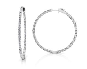 Another dimension of sparkle is created with this inside out hoop earring style. A single row of sparkly prong set diamonds line the front side and inside. These medium sized hoops are the perfect accessory for any occasion. Available in five different sizes ranging from .82 carat to 2.07 carats! A great gift for the women in your life, these earrings can be custom made according to your choice in metal type and diamond quality. This diamond earring style is available in small and large sizes also.