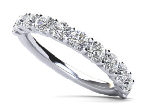 This anniversary ring features a brilliant cut round diamonds along the shank. The ring is available in 5 different total carat weight options and diamond qualities. Each diamond is set in a U-Shape cup in a common prong setting. This design feature allows the diamonds to show from the side of the ring. Customize your ring by selecting the type of metal and size to truly make it your own.