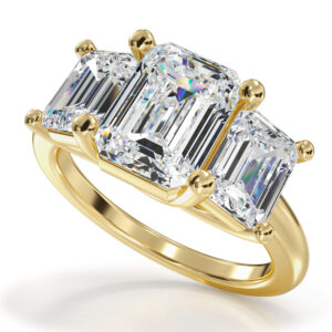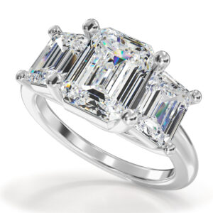 This breathtaking 3-stone emerald cut diamond ring features three expertly cut diamonds, each showcasing the sharp, elegant lines of the emerald cut. The center diamond, flanked by two smaller diamonds, creates a striking and timeless design that exudes sophistication and charm. The clean, angular cuts of the emerald diamonds enhance their brilliance, making this ring a captivating statement piece. Perfect for special occasions or as a symbol of lasting love, this ring combines classic beauty with exceptional craftsmanship, making it an unforgettable addition to any jewelry collection.