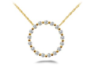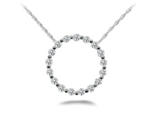 Circles are on the leading edge in the design world . whether it’s for dÃ??Ã?©cor, fashion, or jewelry. Here’s a fabulous piece that tells the world you’re on the leading edge too! This pendant is available in 3 different sizes, ranging from .37 carat to Ã??Ã?¾ of a carat total diamond weight. The circle appears to float invisibly on the chain and the result is lovely. It’s available in either gold or platinum . simple, elegant, perfect
