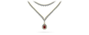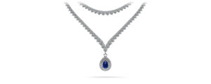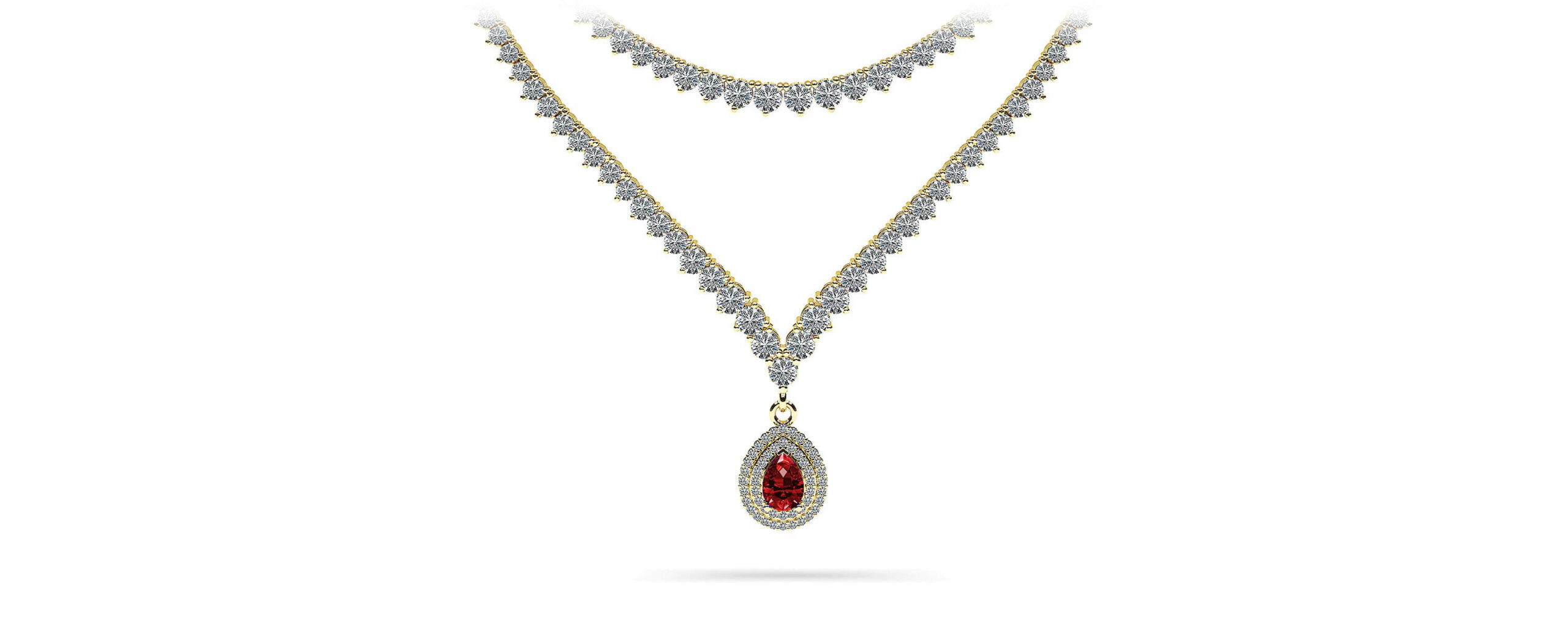 More is better with this beautiful 3-prong two-strand diamond necklace with a halo teardrop gemstone pendant. While the first row subtly graduates toward the center, the second strand elegantly drops into a point and finished off with a breathtaking pendant. Customize this necklace with your preferred metal and diamond quality! All gemstones are AA quality.