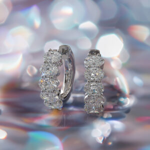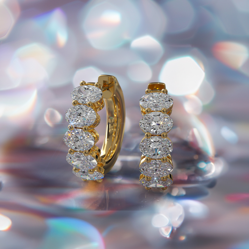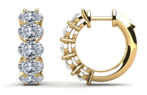 These gorgeous diamond hoop earrings feature five beautifully cut oval shape diamonds on each ear aligned horizontally. You can customize these earrings by selecting the type of metal, diamond size, and quality.