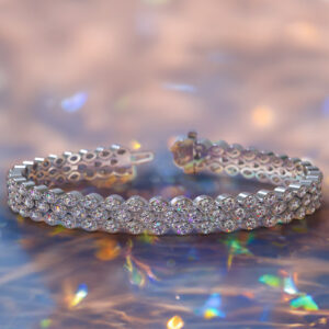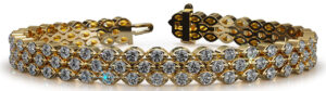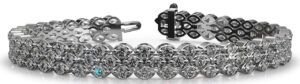 This stunning diamond bracelet features staggered three rows of brilliant cut round diamonds. Each diamond is set in a marquise shaped link which creates its unique look. You can customize this bracelet by selecting the type of metal, diamond quality, size, and length.
