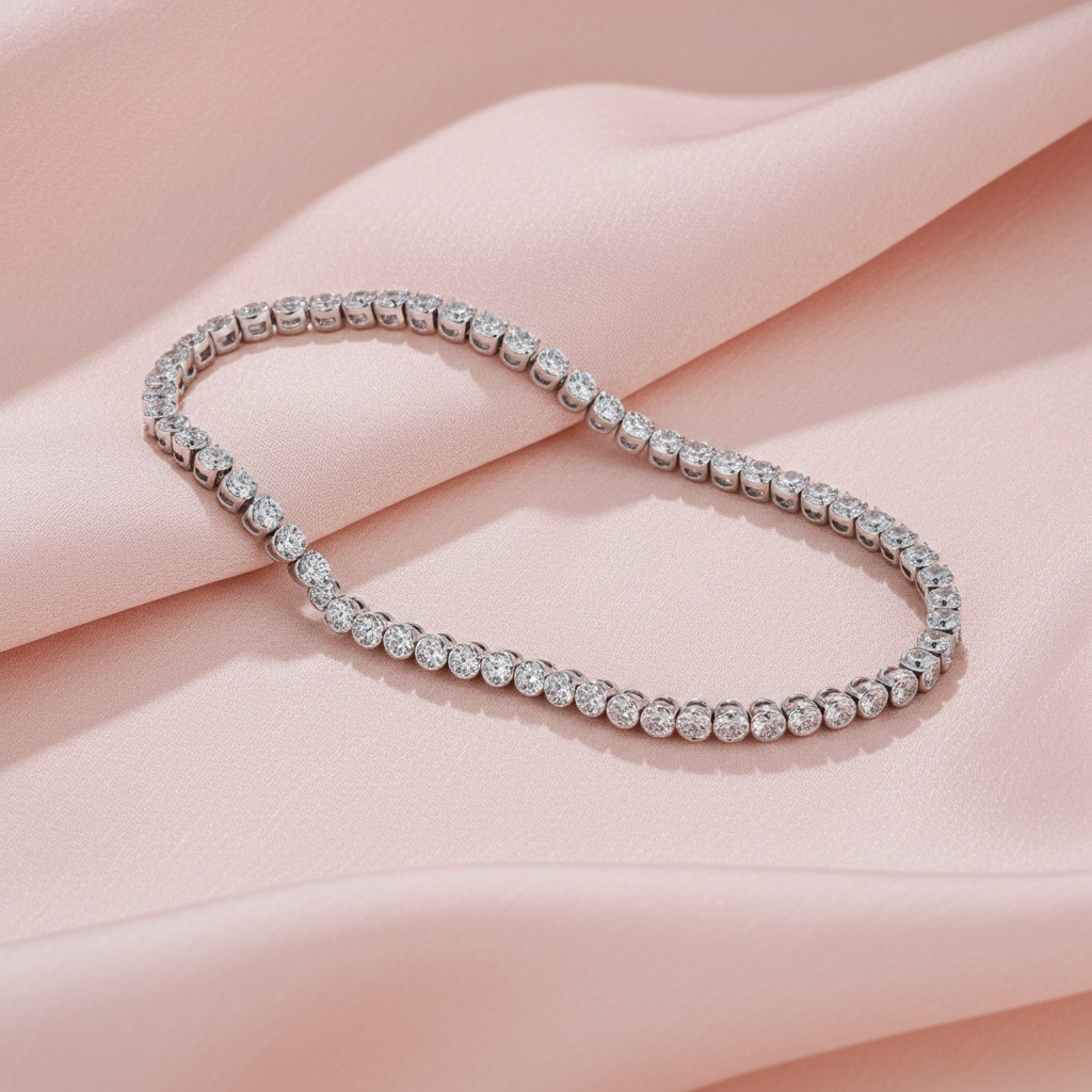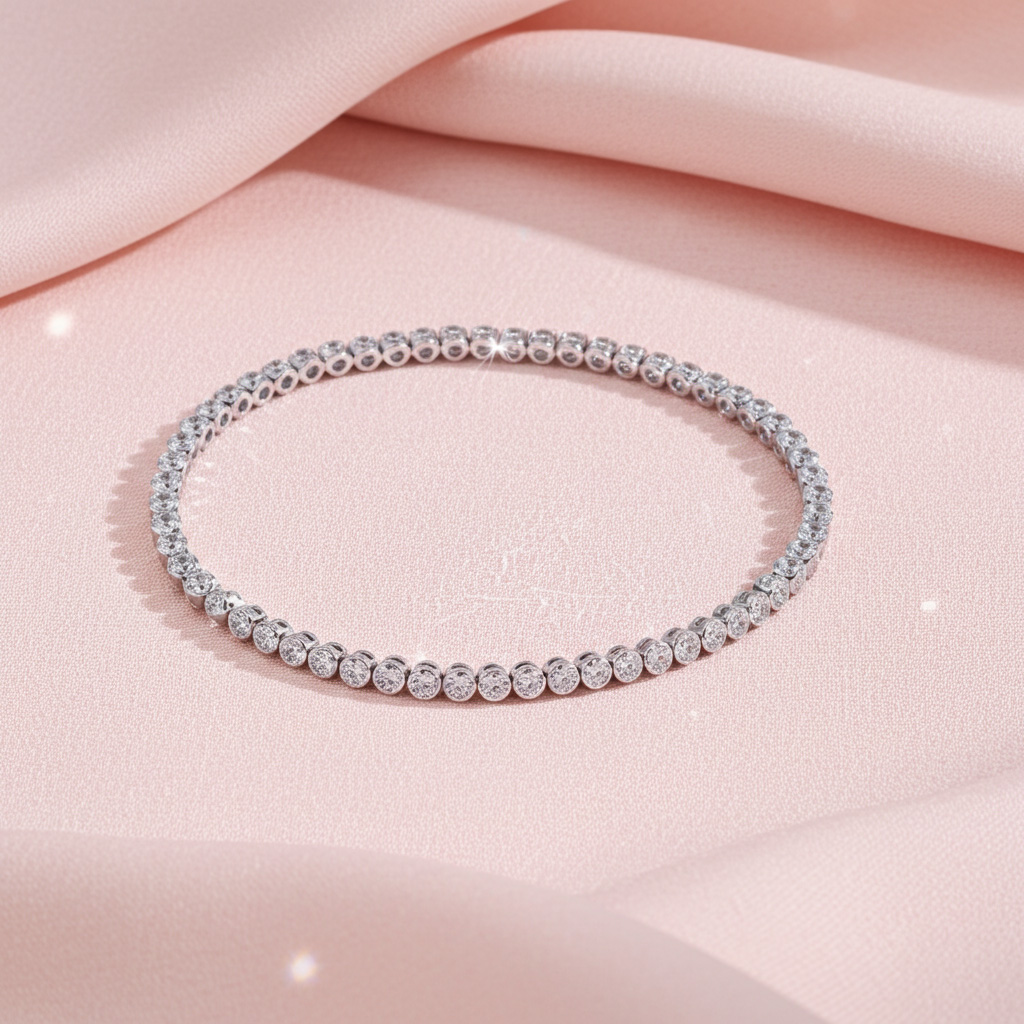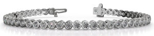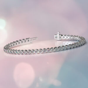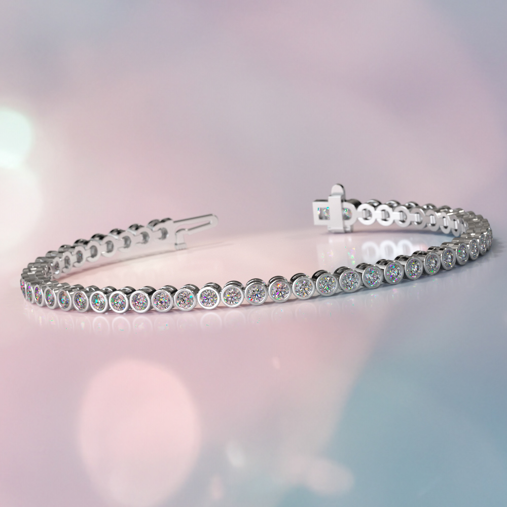 This elegant diamond tennis bracelet features brilliant cut round diamonds throughout set in bezel settings. The bracelet is available in multiple carat weights, and you can customize it by selecting the type of metal, diamond quality, metal type, and length.