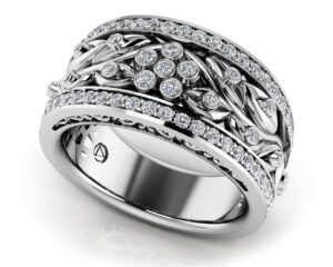 The whimsical pattern of this diamond ring combined with the elegant two-tone design creates a vintage inspired and unique ring. There are 78 diamonds total set along the edges and interior of this ring. Perfect as a fashion ring, anniversary ring or wedding band, this ring has a lot of sparkle. Customize it based on your favorite metal type and diamond quality for a gorgeous ring you’ll love to wear!